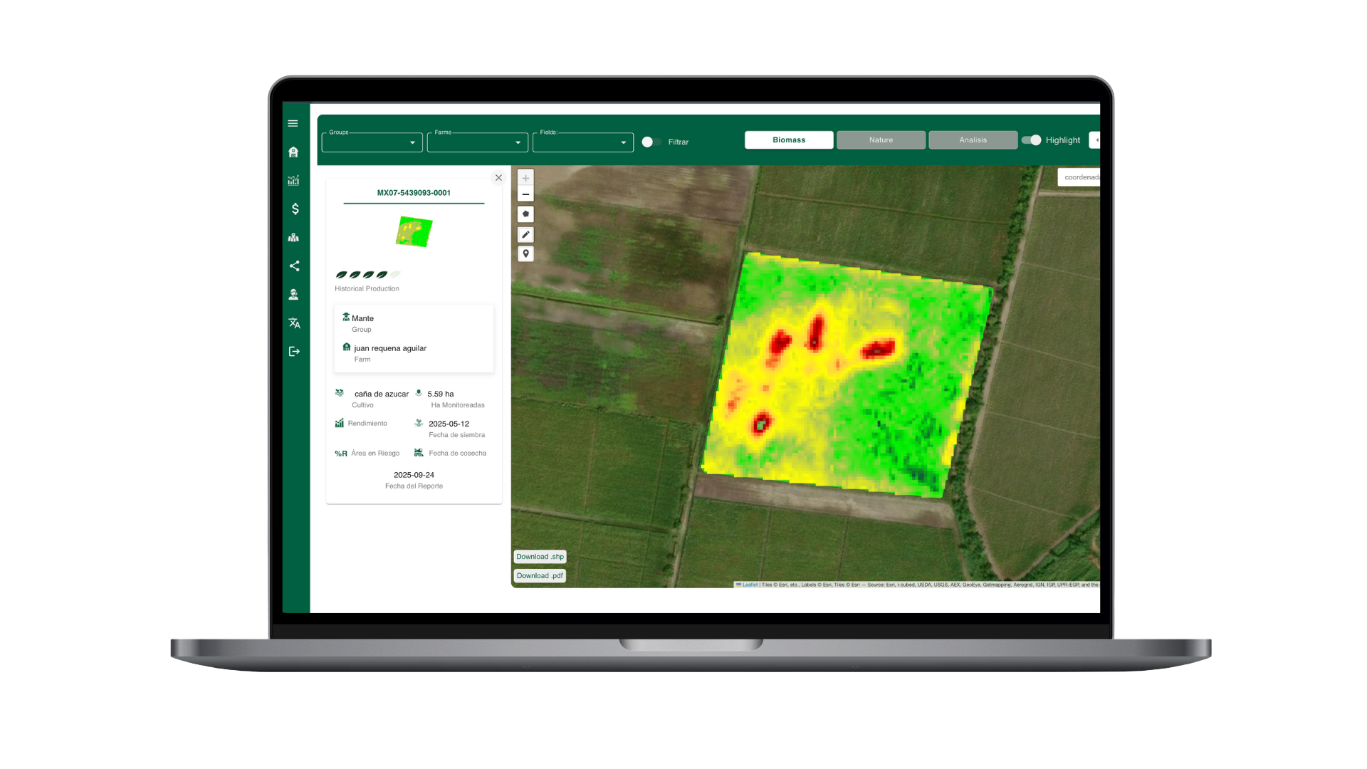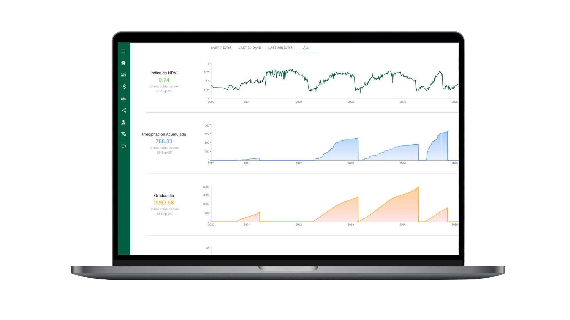 Actualizamos las condiciones del campo a diario usando datos satelitales de alta resolución y climáticos. Esto permite detectar riesgos temprano y tomar acción a tiempo.